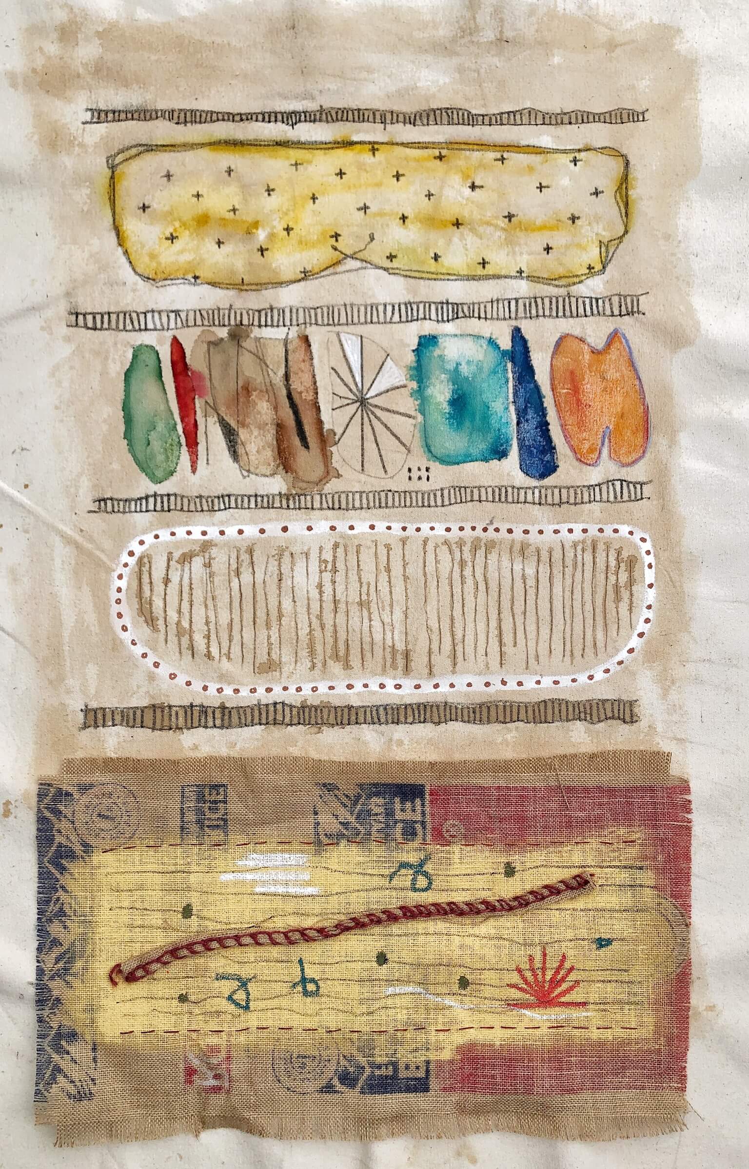 Mixed media on unstretched cotton canvas. Signed and titled on the back. Needs framing. Ships rolled.