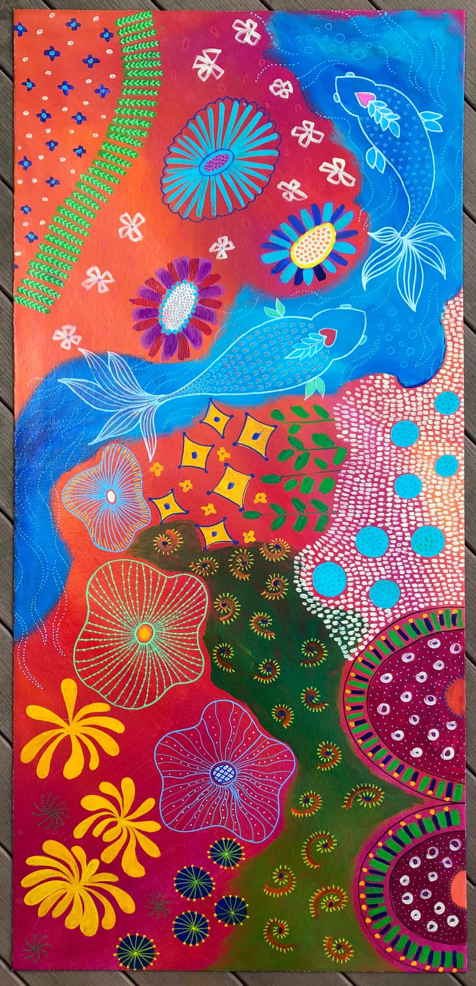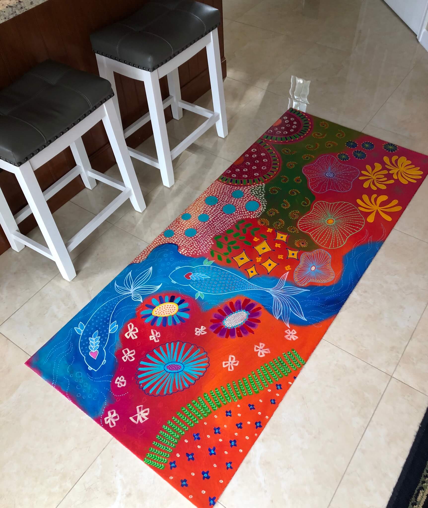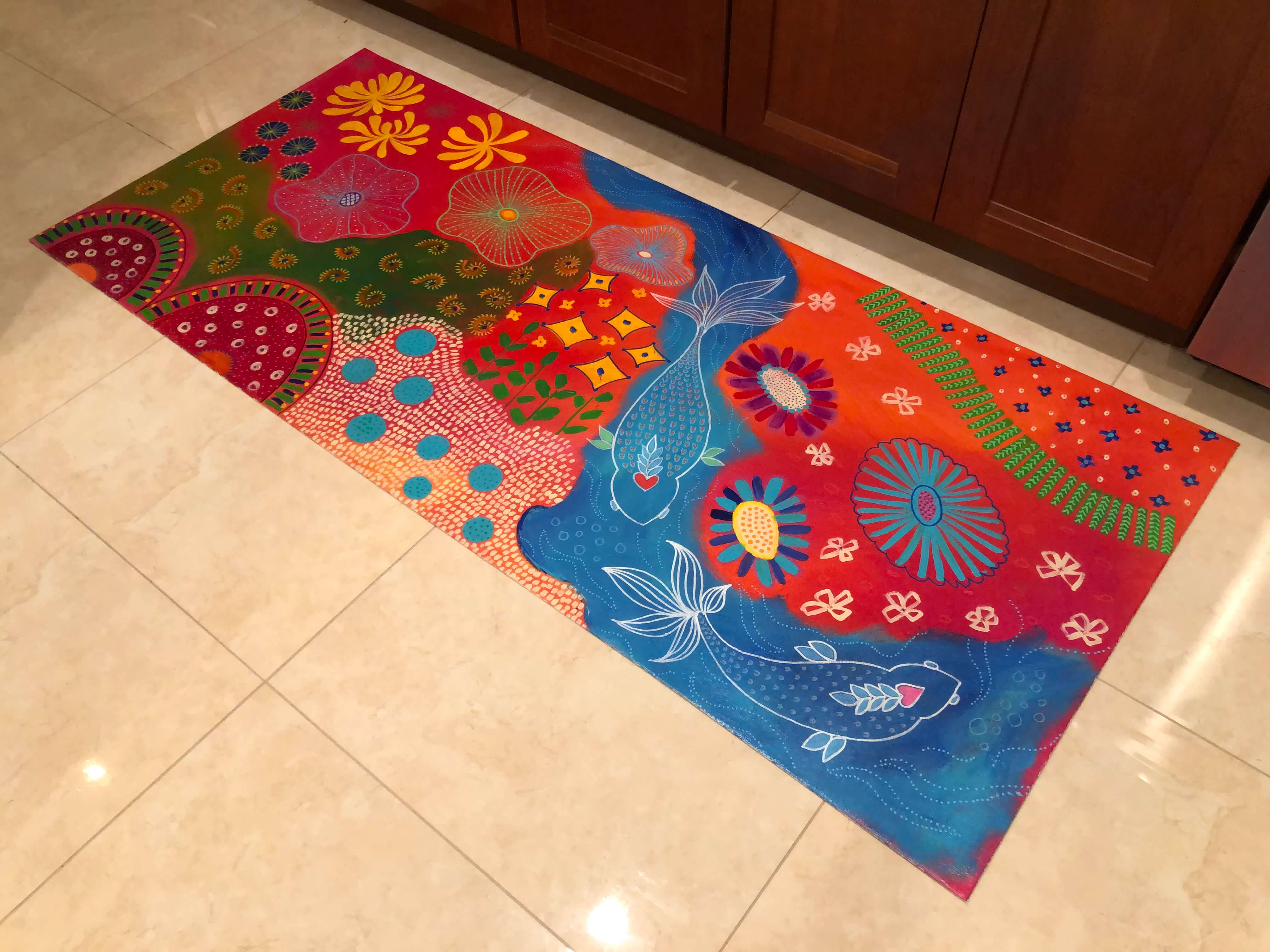 Size: 30″x69″ Hand painted on heavy weight primed canvas and the edges have been folded. Protected with several coats of varnish.